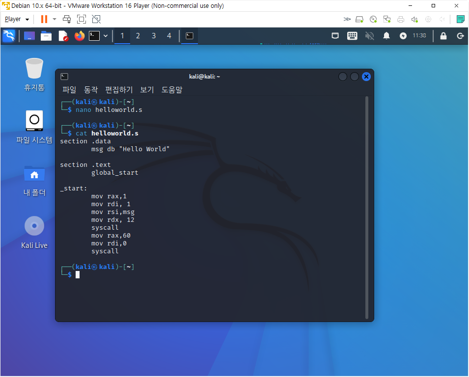 syscall์ ํตํด hello world๊ฐ ์ถ๋ ฅ๋ ๊ฒ์ด๋ค.