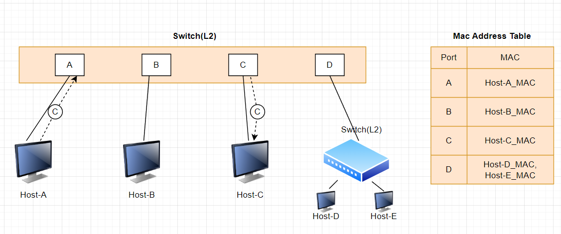 - Host-A์์ Host-C๋ก ํจํท ์ ์ก ์ ํด๋น ๋ ธ๋๋ก๋ง ์ ์ก