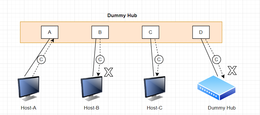 (1) Hub(ํ๋ธ) : ๋ค์ด์จ ์ ํธ๋ฅผ ์ฐ๊ฒฐ๋ ๋ชจ๋ ํฌํธ๋ก ์ ๋ฌํ๋ ์ค๊ณ ์ฅ์น (Dummy Hub)
