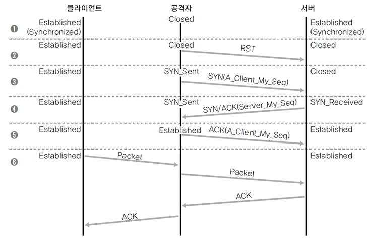 ์ ์์ ์ธ ์ฌ์ฉ์์ ์ถ๋ฐ์ง IP์ Port๋ก ์์กฐํ๊ณ Sequence Number๋ฅผ ์์ธกํ์ฌ ์ธ์ ํ์ทจ.